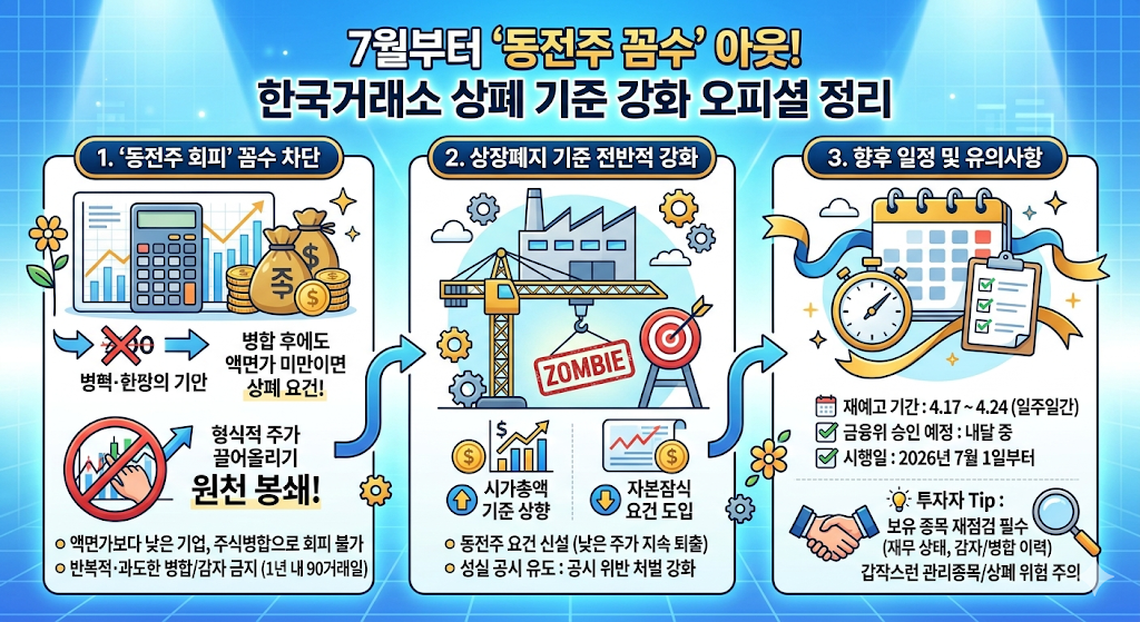 이번 개정안에는 단순히 동전주 규제뿐만 아니라 시장의 '좀비 기업'을 퇴출하기 위한 강력한 기준들이 포함되었습니다.