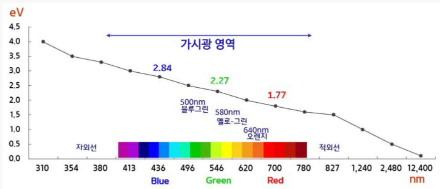 Visible LED은 주로 갈륨비소(GaAs), 갈륨인(GaP), 갈륨비소인(GaAsP), 갈륨질소(GaN) 등의 화합물 반도체로 만들어집니다. 이러한 화합물 반도체의 특성에 따라 LED 빛의 색깔이 달라집니다. 예를 들어, GaAs는 적외선 영역, GaP는 녹색 영역, GaAsP는 황색 영역, GaN은 청색 영역의 빛을 발생시킵니다.
