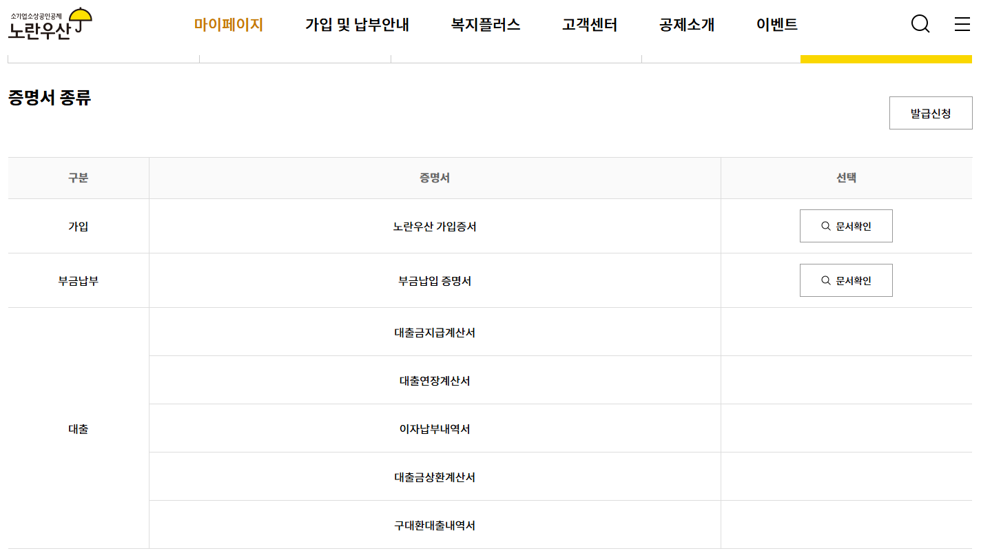 2. [마이페이지] → [내역조회 및 발급] → 가장 아래 ‘제증명발급’ 클릭